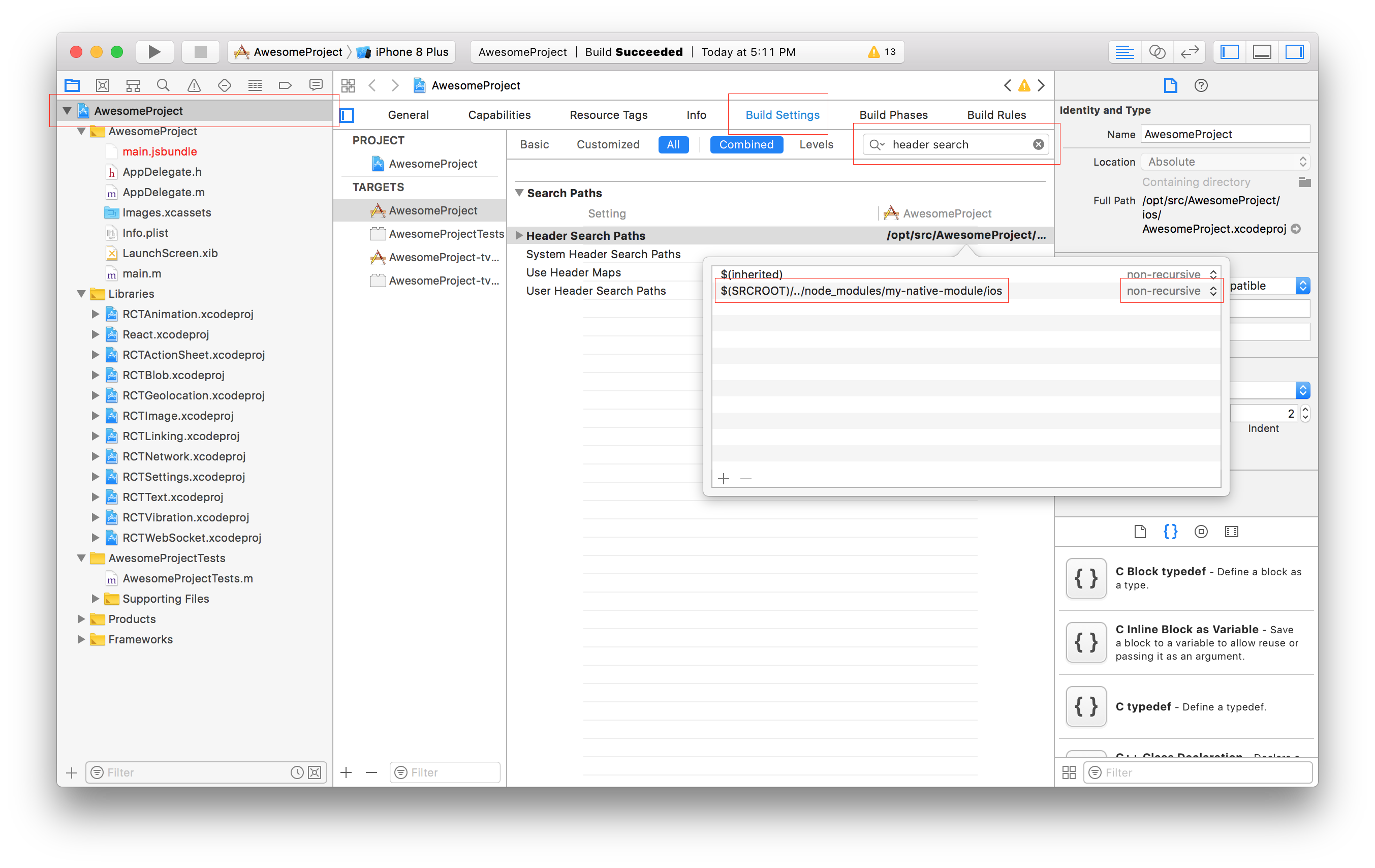 如果您确实需要从原生调用它,那么我们需要知道库的头文件。为此,您必须转到项目文件,选择 Build Settings 并搜索 Header Search Paths。在那里,您应该包含您的库的路径。(本文档过去曾推荐使用 recursive,但现在不再推荐,因为它可能导致细微的构建失败,尤其是在使用 CocoaPods 时。)